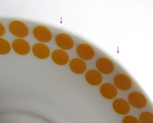 チェコスロバキアThun製コーヒーカップ&ソーサー。 黄色のドットがかわいいです♪ 年代不明 ※1993年に国が分離していますので、その年以前のものとなります。 カップ直径(口):約7.3cm カップ高さ:約6.3㎝ ソーサー直径:約13.5cm 写真で説明している部分がありますが、ヒビ・カケはなく、ソーサーに保管上の最小限のスクラッチと薄く釉薬が削れているような部分があるものの、全体的には、良好なヴィンテージコンディションです。 ※比較的、すぐ気づくようなもののみ、説明でお知らせしています。古いものに珍しくないものとして、写真で説明していない、よく見たときにわかるような、小さな点や、釉薬のムラなどについては、ご了承ください。 Vintageメインページはこちら |