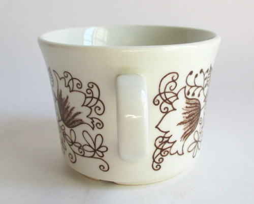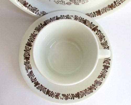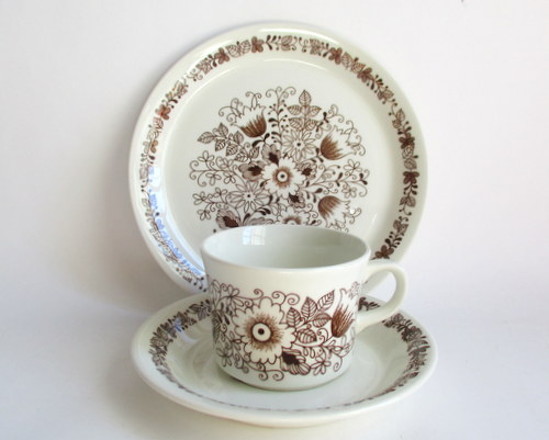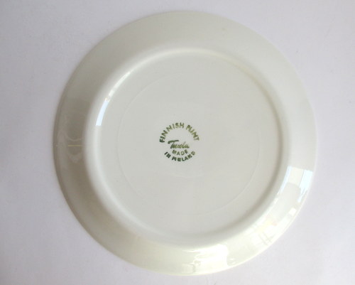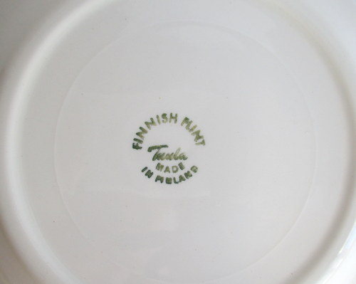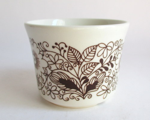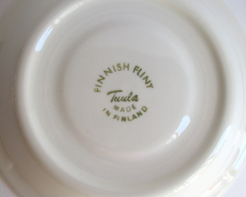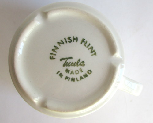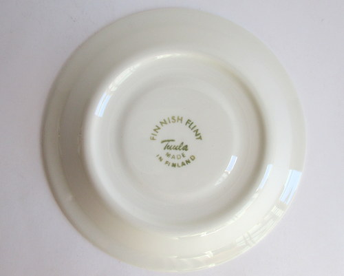 フィンランドARABIA製のトリオ。 ※バックスタンプが、FINNISH FLINTとなっていますが、これは、Arabiaの海外輸出用のスタンプです。 フォルムGoran Back、デコレーションEsteri Tomulaによる、Tuulaシリーズです。 ブラウンで、温かみのある雰囲気で描かれた、たくさんのお花が、とても素敵です! 1970年代 カップ直径:約7.4cm カップ高さ:約5.6cm ソーサー直径:約13.5cm ケーキ皿直径:約17.0cm 写真で説明している部分がありますが、この時代のArabiaのものとしては、言及すべき部分が少なく、ケーキ皿に良く見るとスクラッチが見られるものの、、ヒビ・カケなどもない、全体的には、とても良好なヴィンテージコンディションです。 ※比較的、すぐ気づくようなもののみ、説明でお知らせしています。古いものに珍しくないものとして、写真で説明していない、よく見たときにわかるような、小さな点や、釉薬のムラなどについては、ご了承ください。 Vintageメインページはこちら |