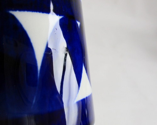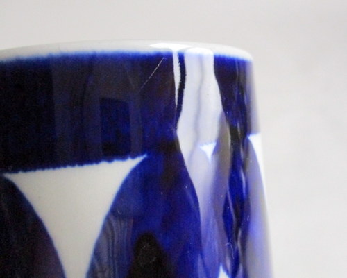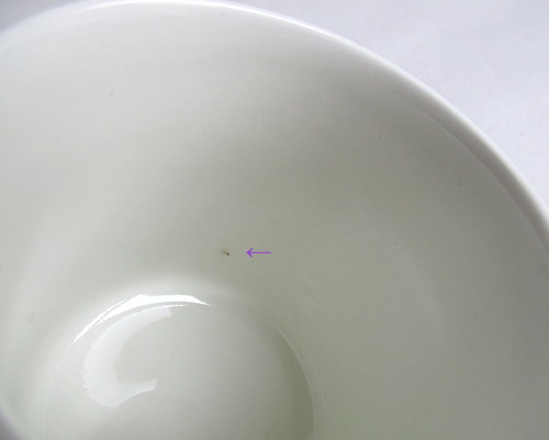 | 以下4枚の写真、光にかざしてみると、いくつか、ツルツルとしたツヤ感のない、釉薬のムラのような部分や、ほそいキズが見られます。普通において見た分には、目立たず全体的には、つややかです。 | |