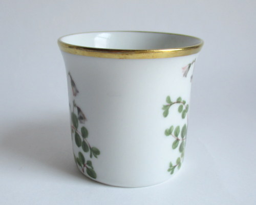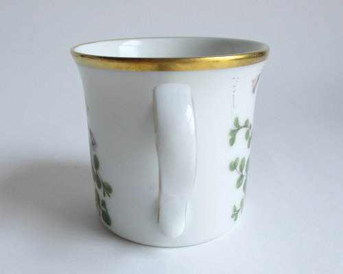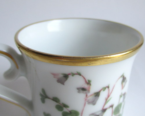 ドイツEschenbach製カップ&ソーサー。 経緯は不明ですが、ドイツのメーカーがスウェーデンの地方の花をモチーフに作ったものです。 Smaland地方:リンネソウ 年代不明 ※ディーラーさんの情報ですと、1970-80年代と思われるとのことでした。 カップ直径(口):約6.5cm カップ高さ:約6.2cm ソーサー直径:約12.0cm 写真で説明している部分、特に、金彩の付着が価格と関係しています。 ヒビ・カケ等はなく、保管上の最小限のスクラッチだけで、全体的には、まずまずのヴィンテージコンディションです。 ※比較的、すぐ気づくようなもののみ、説明でお知らせしています。古いものに珍しくないものとして、写真で説明していない、よく見たときにわかるような、小さな点や、釉薬のムラなどについては、ご了承ください。 Vintageメインページはこちら |