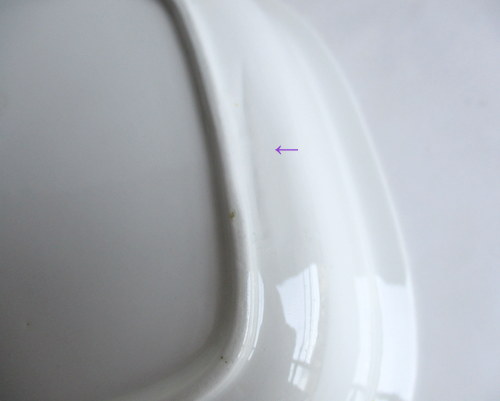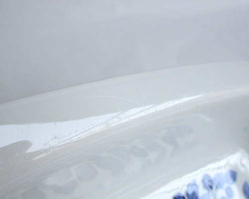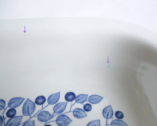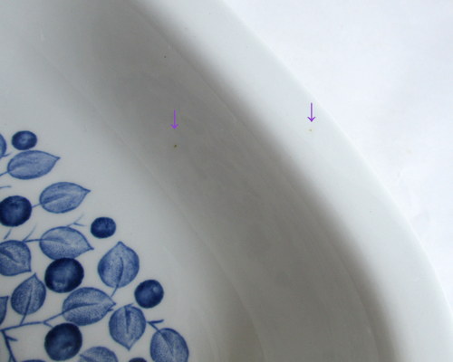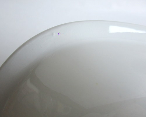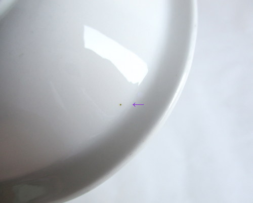 | 釉薬のムラが見られます。写真撮影のために向きを替えていますが、上から5枚目の写真で説明している青い色素の付着の上のほうです。 | |