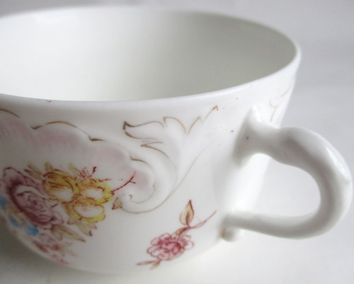 | 以下、ソーサー、カップすべての写真について、金彩やパターンのロスが広範囲に見られます。 また、近くで、光にかざしながらみると、全体的にあまり気を使わず、洗いこまれた小キズやくもりによる使用感があります。 |