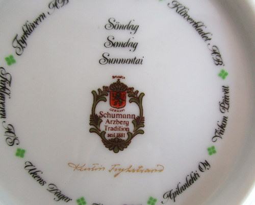 ドイツSchumann Arzberg製プレート。 フィンランド/スウェーデン人デザイナーKerstin Frykstrandによるデザイン、 コレクターズプレートの"Days of the Week"シリーズからの1枚です! 1980年代 直径:約10.5cm とても良好なヴィンテージコンディションです。 ※比較的、すぐ気づくようなもののみ、説明でお知らせしています。古いものに珍しくないものとして、写真で説明していない、よく見たときにわかるような、小さな点や、釉薬のムラなどについては、ご了承ください。 Vintageメインページはこちら |