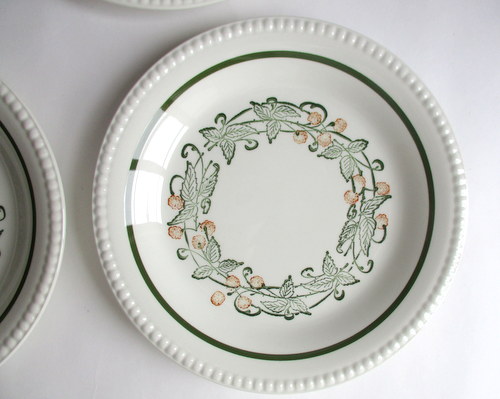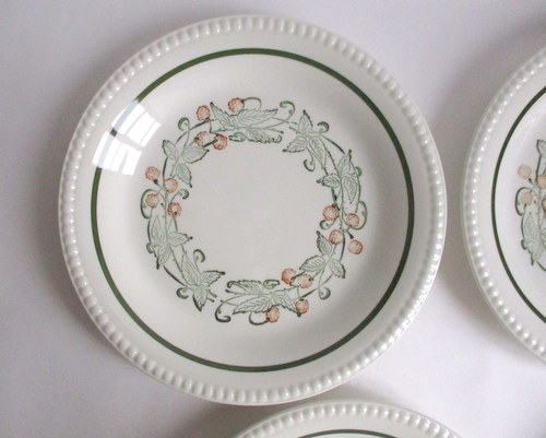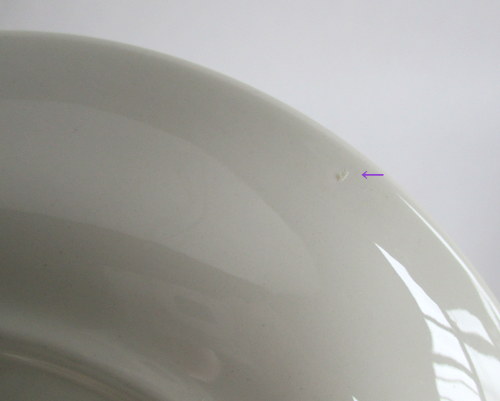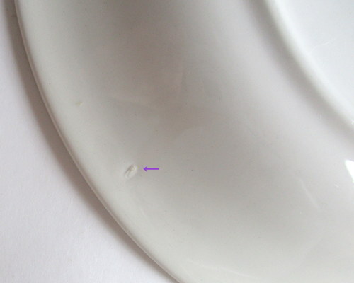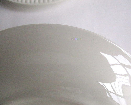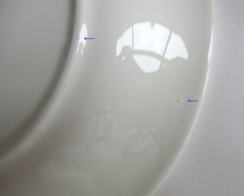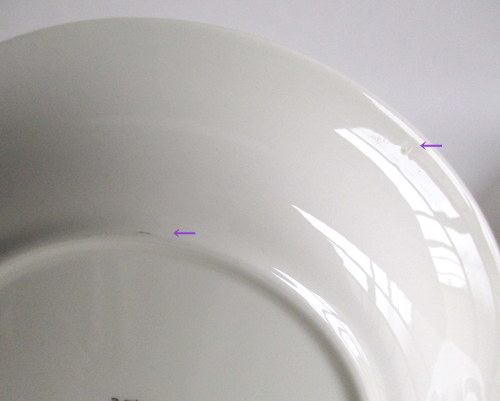 | 以下2枚の写真のように、いずれのプレートも、上のほうで説明しているものと同じような釉薬のムラや、ちょっとした色素の付着が見られるものもあります。 | |