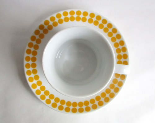 チェコスロバキアThun製コーヒーカップ&ソーサー。 黄色のドットがかわいいです♪ 年代不明 ※1993年に国が分離していますので、その年以前のものとなります。 カップ直径(口):約7.3cm カップ高さ:約6.3㎝ ソーサー直径:約13.5cm 写真で説明している部分がありますが、ヒビ・カケはなく、ソーサーに保管上の最小限のスクラッチと薄く釉薬が削れているような部分があるものの、全体的には、良好なヴィンテージコンディションです。 ※比較的、すぐ気づくようなもののみ、説明でお知らせしています。古いものに珍しくないものとして、写真で説明していない、よく見たときにわかるような、小さな点や、釉薬のムラなどについては、ご了承ください。 Vintageメインページはこちら |
