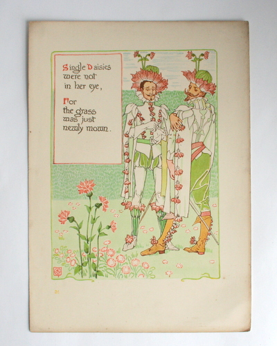 アンティークプリント ※リトグラフ(石版画) 1899年/イギリス 初版 左の写真、Walter Craneによる、ヴィクトリア朝時代の本、<Floral Fantasy In An old English Grarden>からの1枚づつ、ページ順に紹介しています。 Walter Craneは、19世紀にデザインの父といわれるウィリアム・モリスが主導し、大きな影響を与えた芸術運動、アーツ&クラフツにも深くかかわった、イギリスの芸術家です。 アールヌーヴォースタイルで描かれた、植物と人の一体感がとても魅力的で、味のある文字とのバランスもとても素敵な本です。 額装しても、シンプルにそのままピンでとめて飾っても、雰囲気があり、とても素敵なインテリアになります! 約19.0×26.5cm 折り目や、、角のちぎれなどあるものもあります。 年代を考慮した上で、全体的には、大きな破れなどのない、よい状態です。紙の変色などは、130年の時を経たアンティークの風合いとして、ご了承ください。 Vintageメインページは、こちら V-WalterCrane-26 |