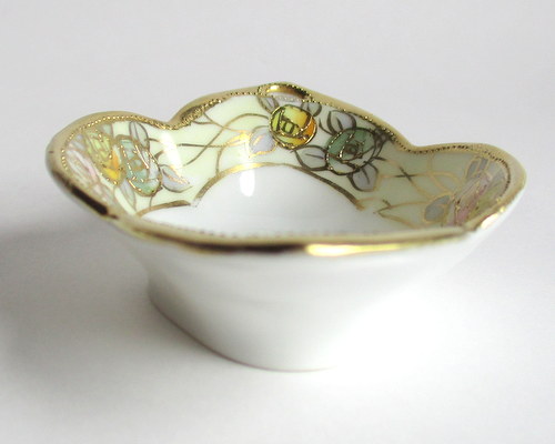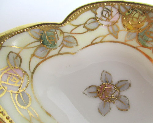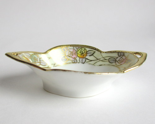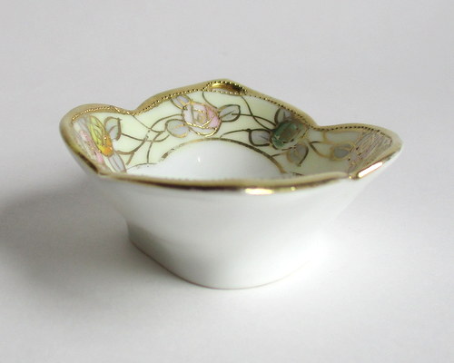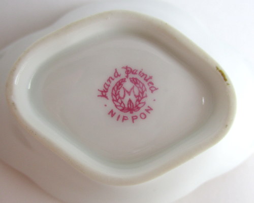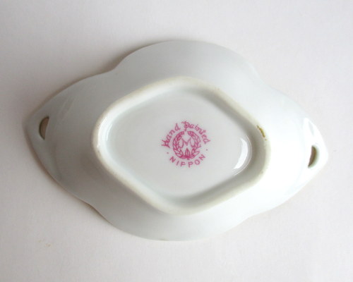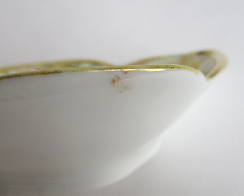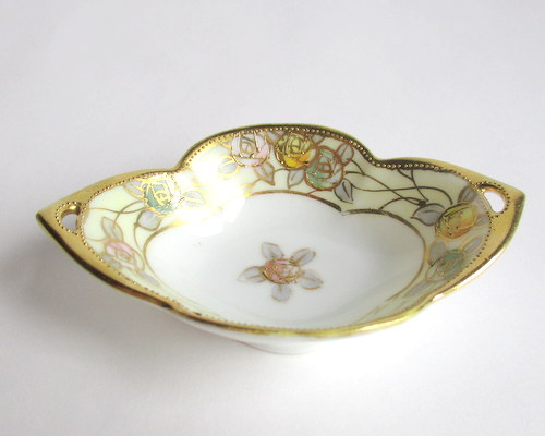 日本・オールドノリタケ製 ソルトディッシュ M・NIPPON印 食卓のテーブルウェアのひとつで、塩を入れて個々にセットされたものです。 オールドノリタケの代表的な技法、盛り上げによる華やかな装飾とアンティーク感が素敵です! 1910−21年 幅:約9.2cm 高さ:約2.4cm 写真で説明している部分がありますが、この時代のものとして珍しくありません。ヒビ・カケ等なく、全体的には、良好なアンティークコンディションです。 ※比較的、すぐ気づくようなもののみ、説明でお知らせしています。古いものに珍しくないものとして、写真で説明していない、よく見たときにわかるような、小さな点や、釉薬のムラなどについては、ご了承ください。 Vintageメインページはこちら 全体的に、ところどころ、金彩の若干の擦れが見られます。 |