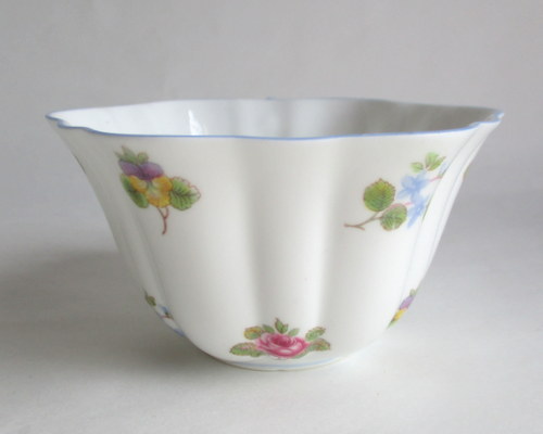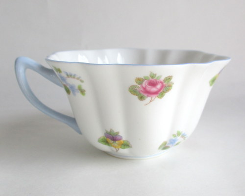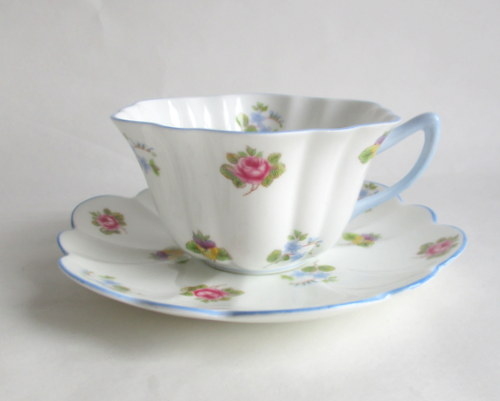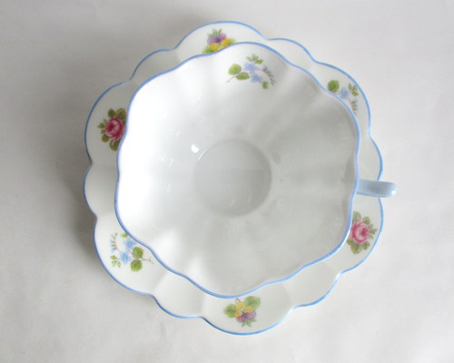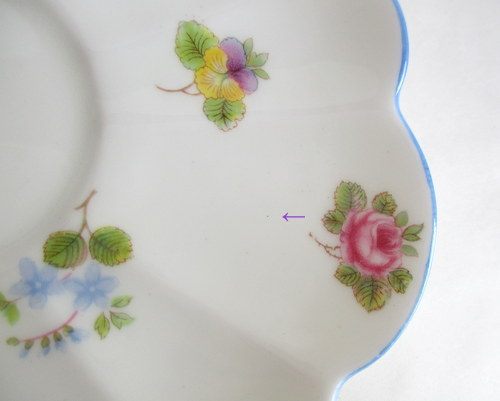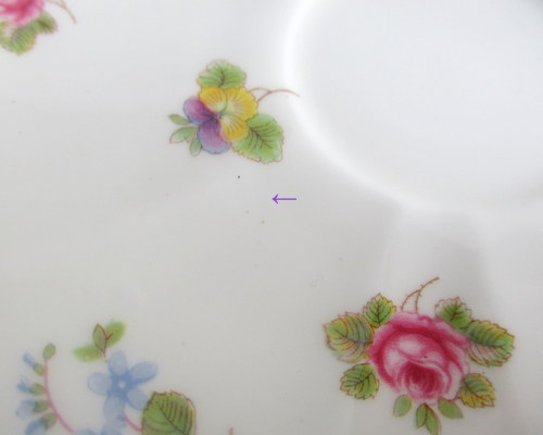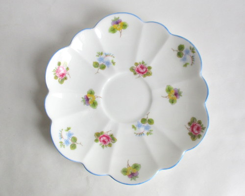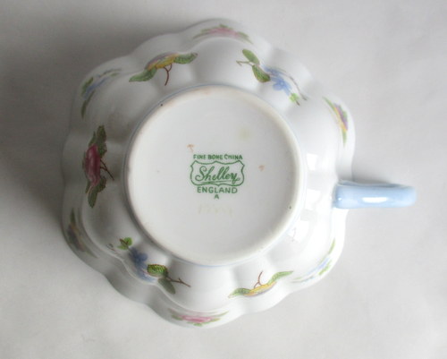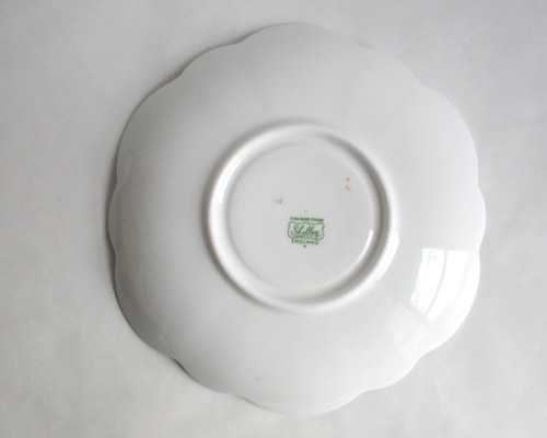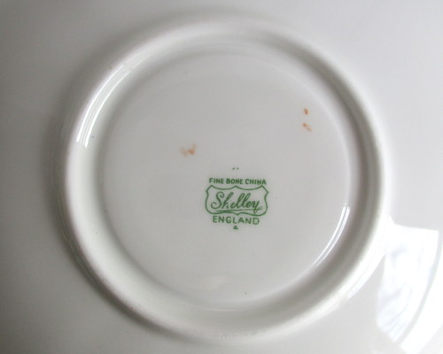 | ソーサーにパターンナンバーがないので、セカンドウェアの可能性がありますが、見た目に問題はなく、指ではじいても、とてもよく響きます。 また、バックスタンプにAの文字がありますので、このソーサーは、1960年以降に製造されたものです。 <参考> shelleyは、1960年から、バックスタンプにAという文字を付けたものを製造しはじめ、次にBを1962、3年頃から、窯を閉じる1966年まで使われたようです。すべてのパターンに使われたかどうかは不明です。 |
