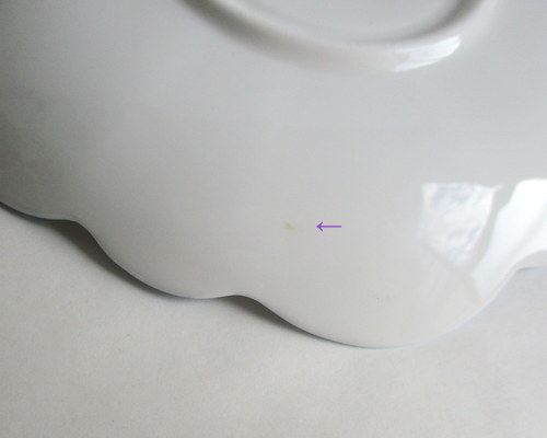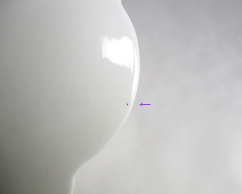 | 右上矢印部分に、光にあてた時に見える約1.7pのヒビがあります。 ほかの矢印部分には、グレーの点があります。 |