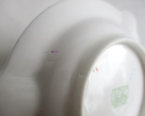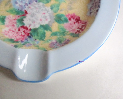 イギリスShelley製、Summer Gloryのアシュトレイ(灰皿)。 チンツ柄が華やかで素敵です♪ 1940−66年 直径:約9.6cm 高さ:約1.7cm 写真で説明している部分がありますが、ヒビ、カケはなく、最小限のスクラッチだけで、全体的には、良好なヴィンテージコンディションです。 ※比較的、すぐ気づくようなもののみ、説明でお知らせしています。古いものに珍しくないものとして、写真で説明していない、よく見たときにわかるような、小さな点や、釉薬のムラなどについては、ご了承ください。 |
