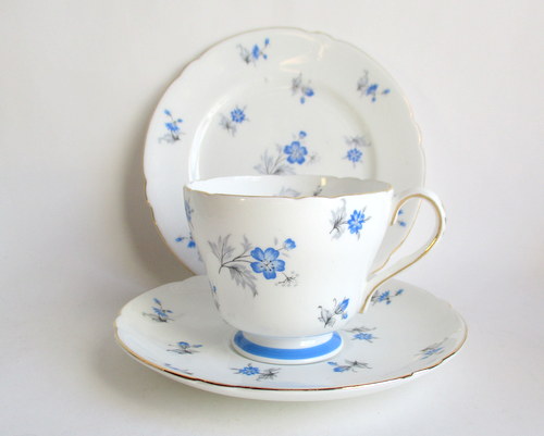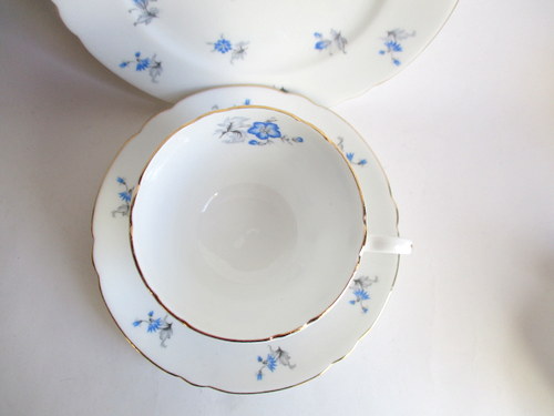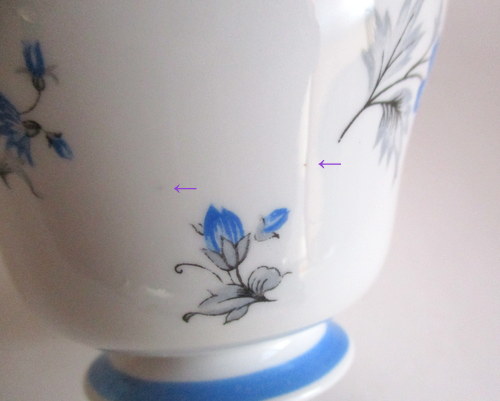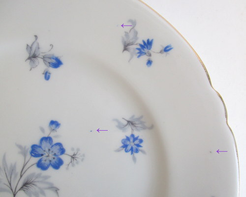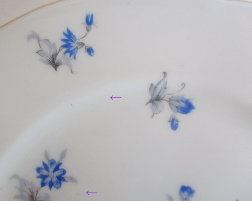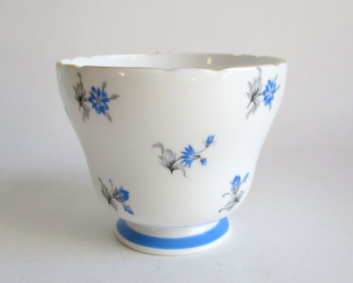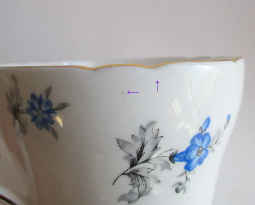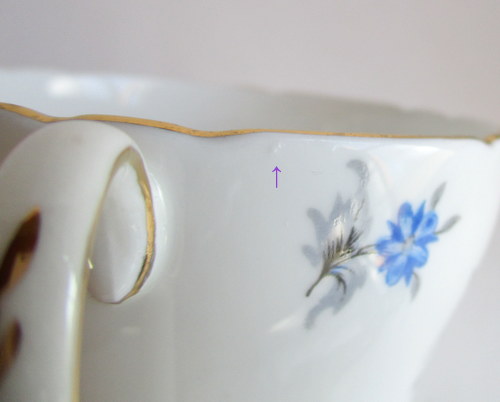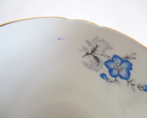 イギリスShelley製、Charmのトリオ。 さわやかなブルーが素敵です! 1960−62年 カップ直径(口):約8.1cm カップ高さ:約6.2cm ソーサー直径:約14.2cm ケーキ皿直径:約15.4cm 写真で説明している部分がありますが、珍しいものではなく、全体的に見たときには、それほど目立つものではありません。ヒビ、カケ等なく、保管上の最小限のスクラッチだけで、全体的には、良好なヴィンテージコンディションです。 ※比較的、すぐ気づくようなもののみ、説明でお知らせしています。古いものに珍しくないものとして、写真で説明していない、よく見たときにわかるような、小さな点や、釉薬のムラなどについては、ご了承ください。 |