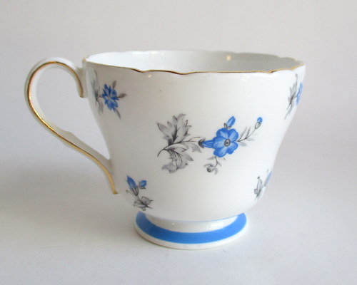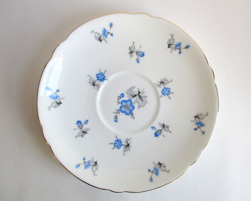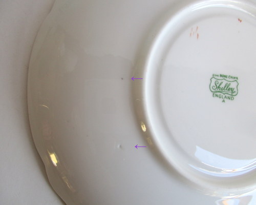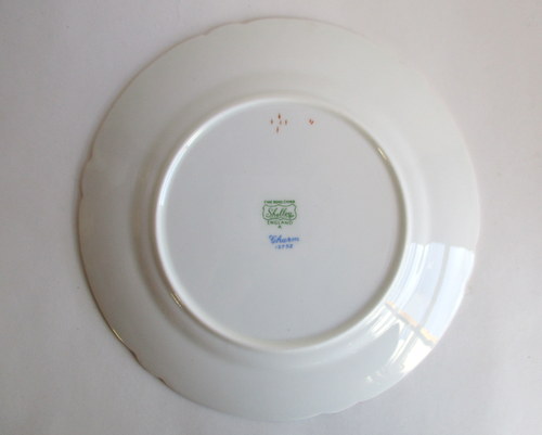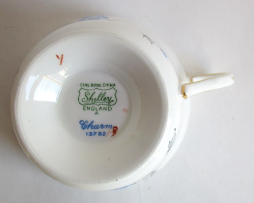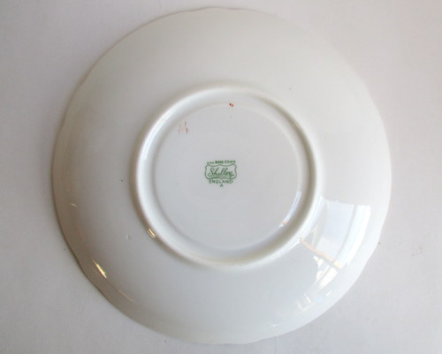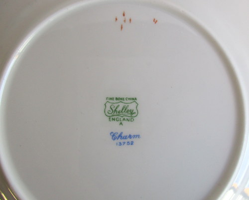 | バックスタンプにAの文字がありますので、このソーサーは、1960年以降に製造されたものです。 <参考> shelleyは、1960年から、バックスタンプにAという文字を付けたものを製造しはじめ、次にBを1962、3年頃から、窯を閉じる1966年まで使われたようです。すべてのパターンに使われたかどうかは不明です。 |