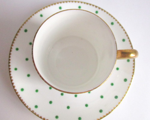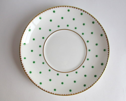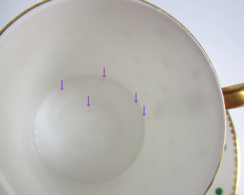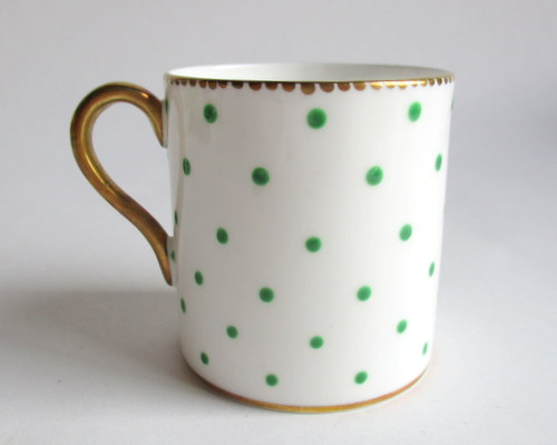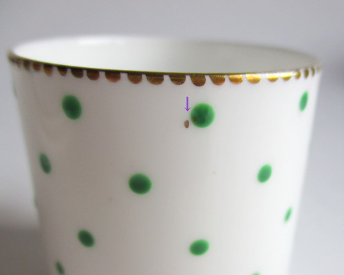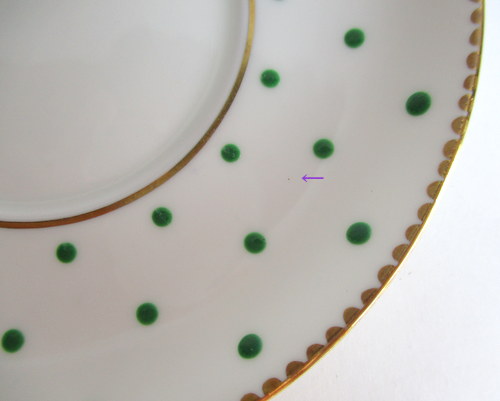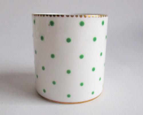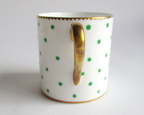 イギリス shelley製、ポルカドットのデミタスカップ&ソーサー。 shelleyのほとんどのパターンが、転写に少しのハンドペイントを加えたものであるのに対し、ポルカドットは、すべてハンドペイントで仕上げられている希少で、人気の高いパターンです。ポテッと、立体的に塗られたエナメルのドットが本当に可愛いデザインです! 1960-62年 カップ直径(口):約5.3cm カップ高さ:約5.7cm ソーサー直径:約11.8cm 写真で説明している部分がありますが、いずれも珍しいものではなく、全体的に見た場合には、ほとんど目立たないものです。ヒビ・カケ等なく、保管上の最小限のスクラッチだけで、使用感がない、良好なコンディションです。 ※比較的、すぐ気づくようなもののみ、説明でお知らせしています。古いものに珍しくないものとして、写真で説明していない、よく見たときにわかるような、小さな点や、釉薬のムラなどについては、ご了承ください。 Vintageメインページはこちら 矢印部分に点々があります。また、写真には写しにくいのですが、底全体にポツポツとしたものを始め釉薬のムラが見られます。 |