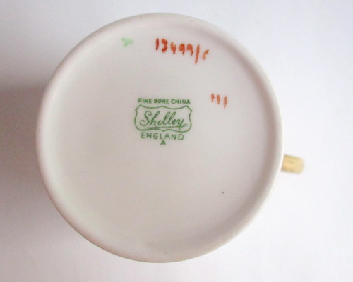 | <参考> shelleyは、1960年から、バックスタンプにAという文字を付けたものを製造しはじめ、次にBを1962、3年頃から、窯を閉じる1966年まで使われたようです。すべてのパターンに使われたかどうかは不明です。 |