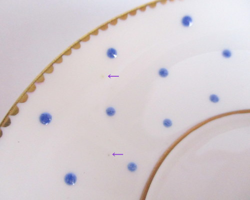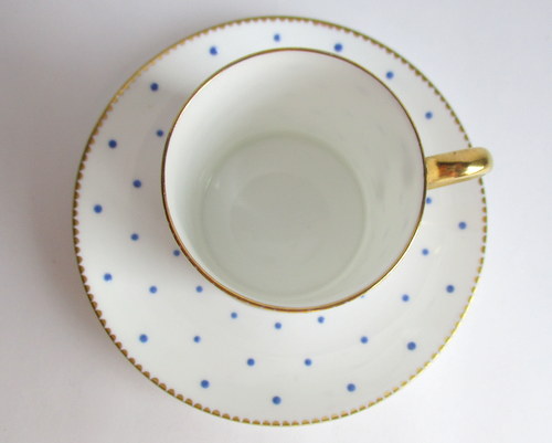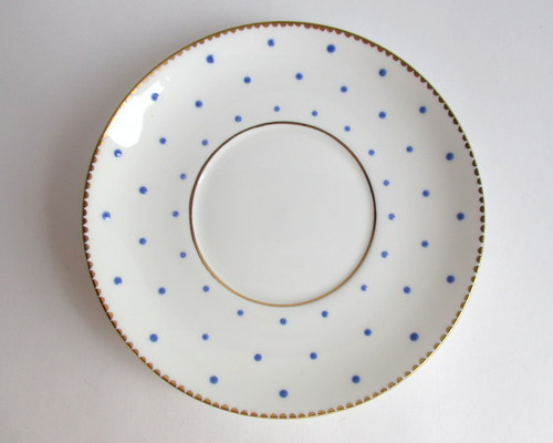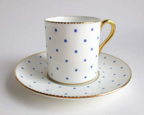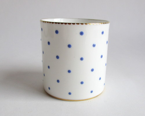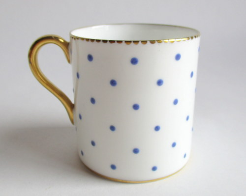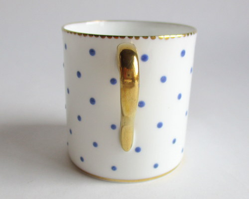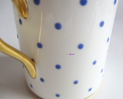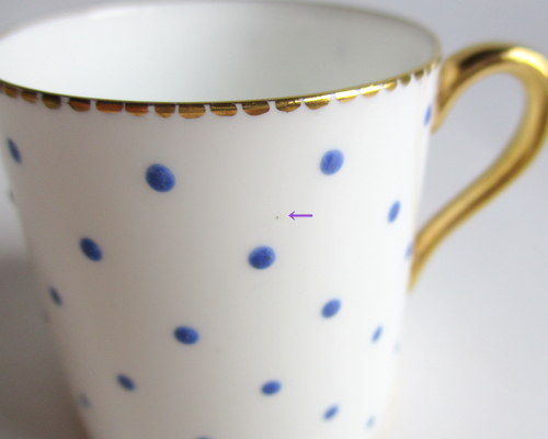 イギリス shelley製、ポルカドットのデミタスカップ&ソーサー。 shelleyのほとんどのパターンが、転写に少しのハンドペイントを加えたものであるのに対し、ポルカドットは、すべてハンドペイントで仕上げられている希少で、人気の高いパターンです。ポテッと、立体的に塗られたエナメルのドットが本当に可愛いデザインです! 1960-62年 カップ直径(口):約5.3cm カップ高さ:約5.7cm ソーサー直径:約11.8cm 写真で説明している部分がありますが、いずれも珍しいものではなく、全体的に見た場合には、ほとんど目立たないものです。ヒビ・カケ等なく、保管上の最小限のスクラッチだけで、使用感がない、とても良好なコンディションです。 ※比較的、すぐ気づくようなもののみ、説明でお知らせしています。古いものに珍しくないものとして、写真で説明していない、よく見たときにわかるような、小さな点や、釉薬のムラなどについては、ご了承ください。 Vintageメインページはこちら |